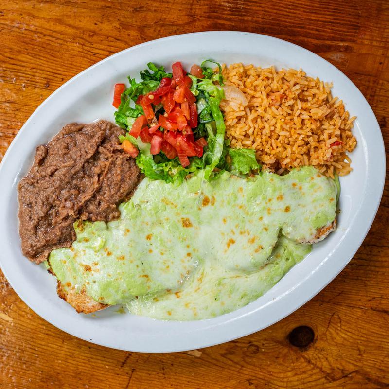 Grilled chicken breast topped with your choice of chili con carne, ranchero sauce, jalapeño sauce, mole, or tomatillo topped with Monterey Jack cheese. Served with rice, refried beans, lettuce, and tomato.