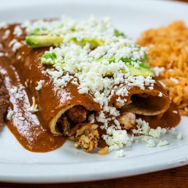 Two chicken enchiladas with your choice of any of the following sauces: spicy ranchero, tomatillo, jalapeño cream, cream, or our traditional mole sprinkled with sesame seeds.