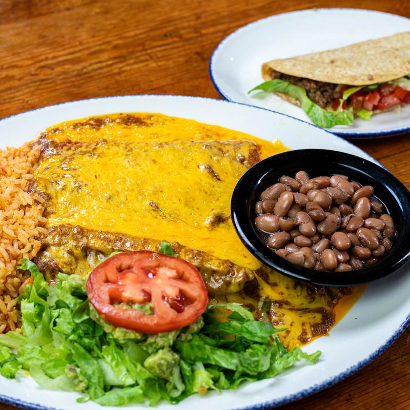 Our signature dish – two cheese enchiladas and one tamale topped with chili con carne, one crispy picadillo taco, and a guacamole salad.
