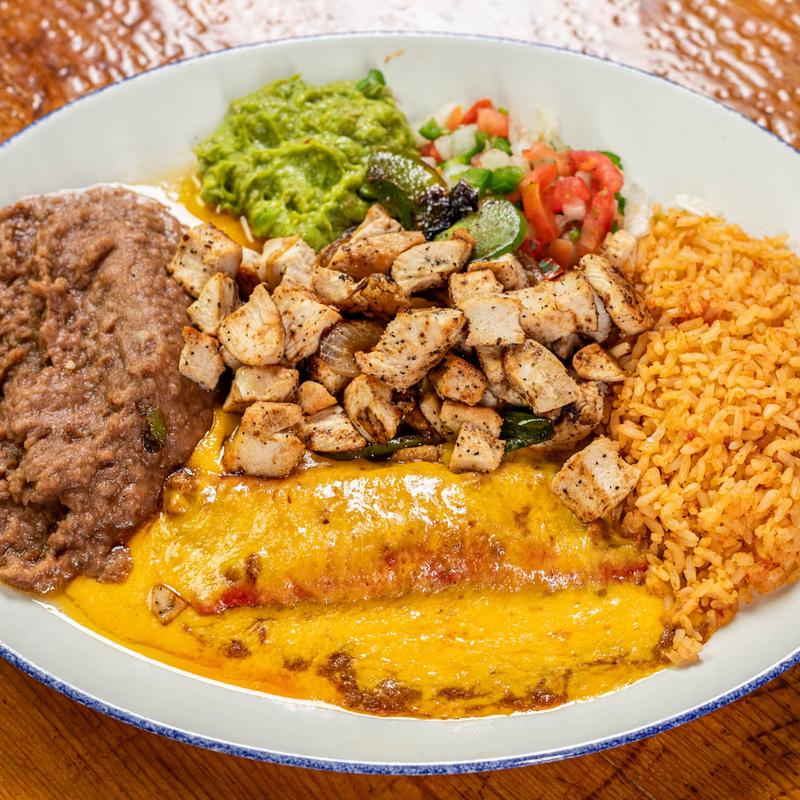 A local favorite – One cheese enchilada topped with chili con carne and a portion of tender beef or chicken fajitas. Served with rice, refried beans, guacamole, and pico de gallo.