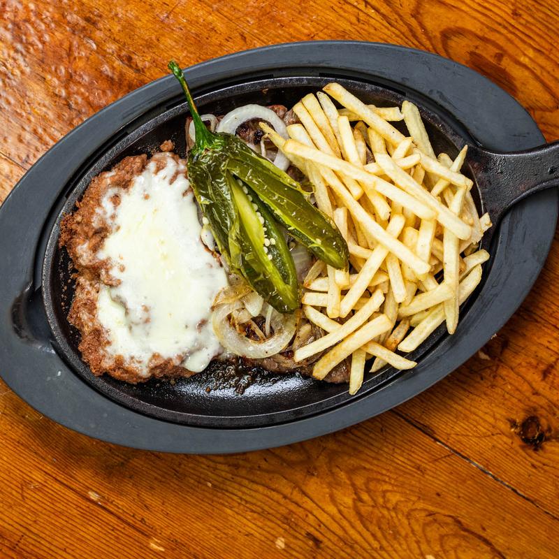 Marinated beef skirt steak topped with sautéed onions and a chile toreado. Served on a hot skillet with French fries and refried beans with melted cheese.